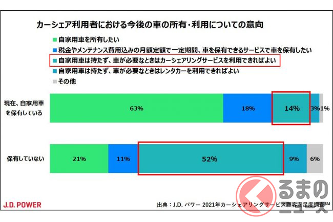 しかし、マイカー保有者と非保有者におけるカーシェアリングサービスの満足度を比べると、マイカー非保有者の満足度は総じて低い結果となっており、これらの層は、買い物等の日常シーンでカーシェアを利用するケースがより多く、利用頻度も高い傾向にあります。