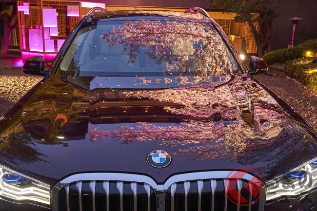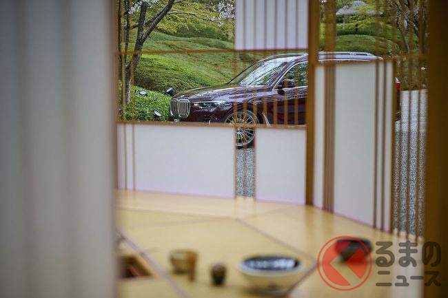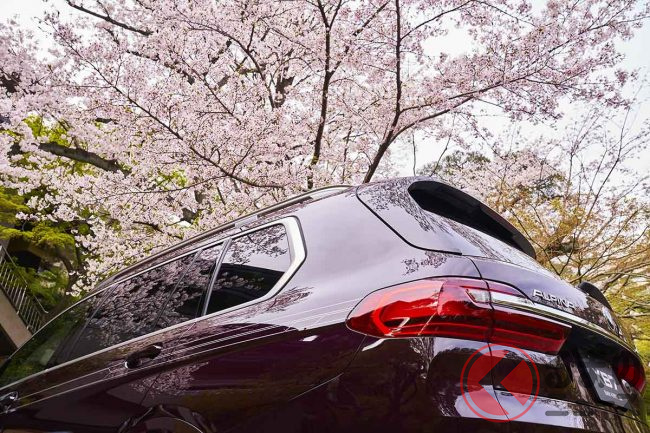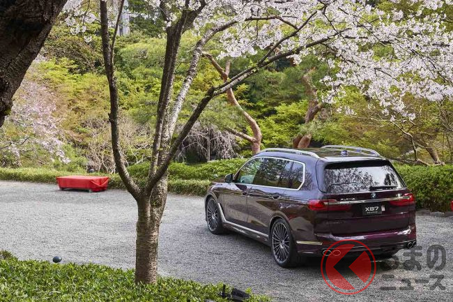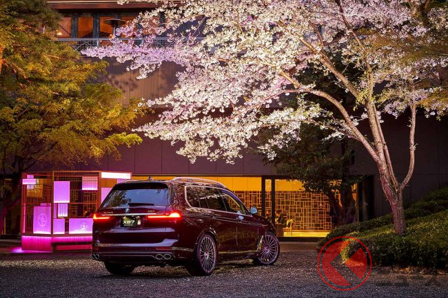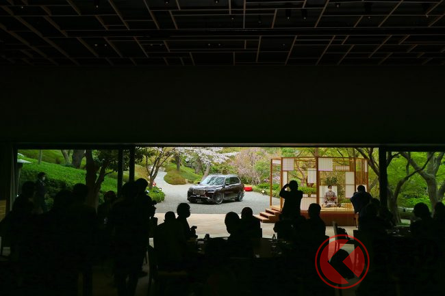 その後に、1万2000坪の日本庭園を望むべく広間の壁が取り払われて現れたのは、満開の桜をバックにした日本初お披露目となるBMWアルピナ XB7であった。