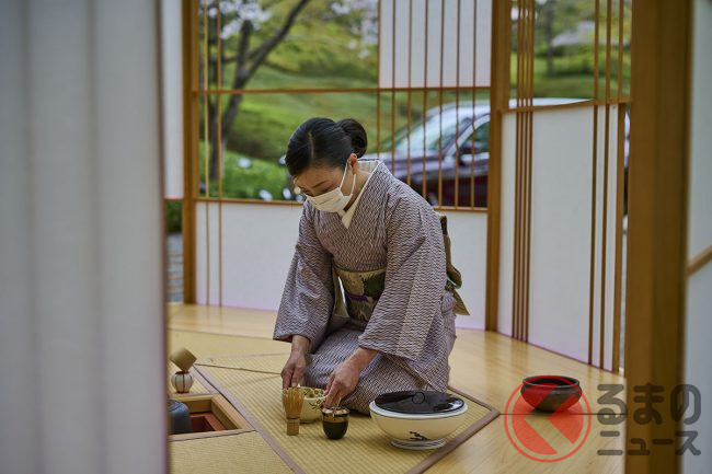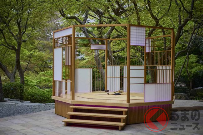 BMWアルピナ XB7の隣には、野点を楽しむべく、オープンな茶室が用意され、発表会に訪れた人びとを一服の茶でもてなしてくれるという凝りよう。茶室や非毛氈を敷いたベンチに座って、桜を愛でながらBMWアルピナ XB7を堪能するという、なんとも優雅な時間であった。
