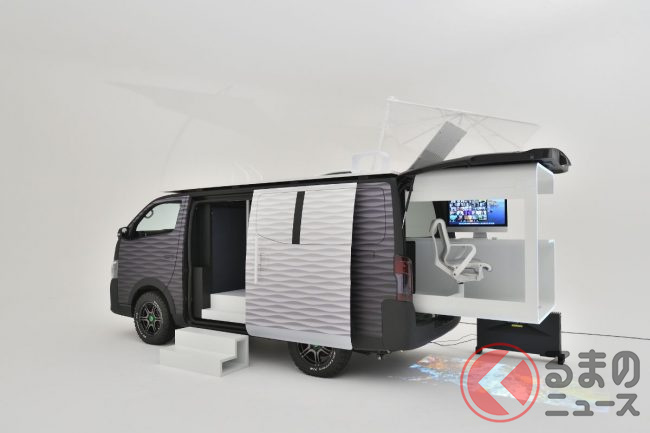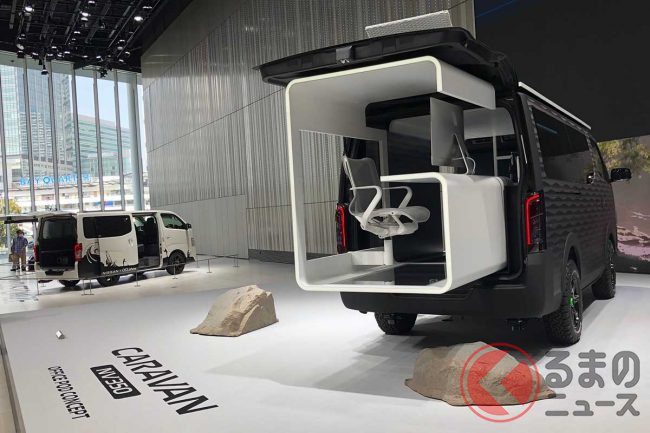 一方で、同じく本社ギャラリー内に展示されている「NV350 キャラバン オグショー ES モビリティコンセプト」は、量産の可能性を秘めたモデルだと感じました。