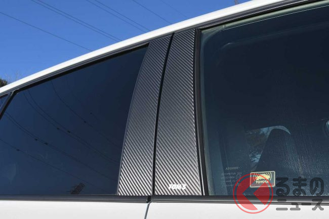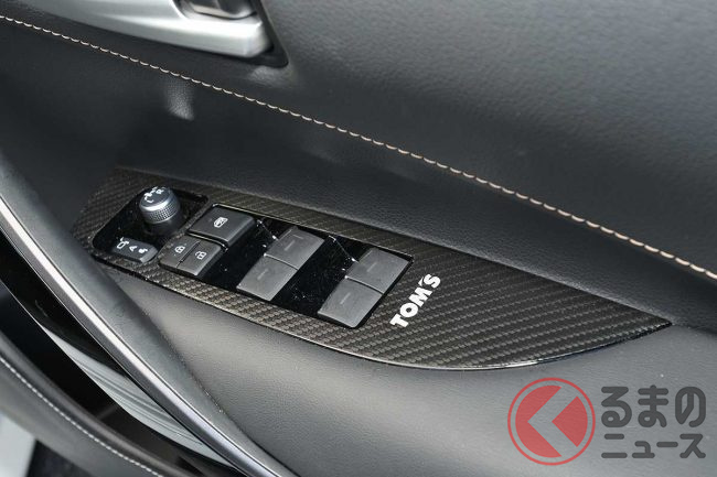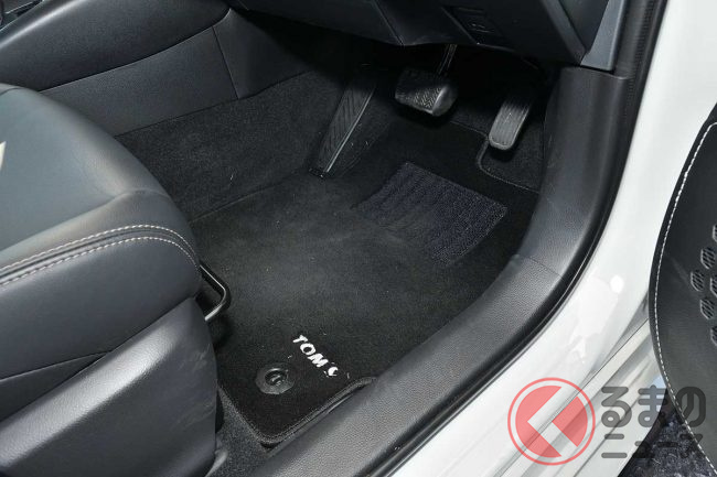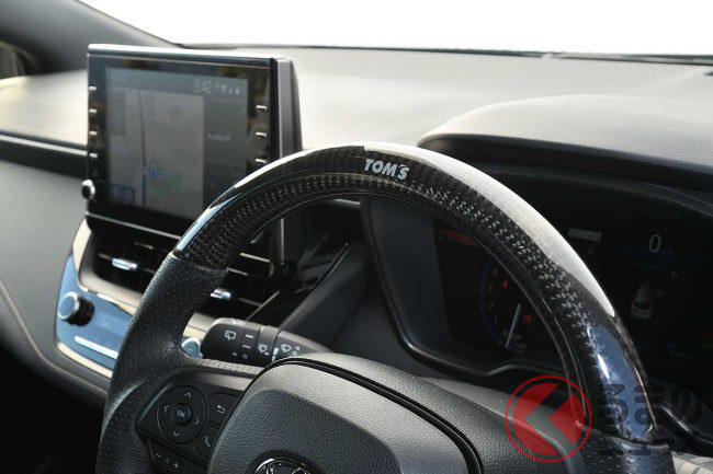 内装は専用のガングリップ形状かつリアルカーボン&パンチングレザー仕様の「トムス・ステアリング カーボン」とPVCレザー素材とステッチによりドア下部のハードプラスチック部の質感アップと傷・汚れ防止効果を持つ「ドアキックプロテクター」を装着。変更部位は少なめですが、インテリアの雰囲気を変えるのに効果的なアイテムです。