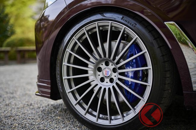 前後サスペンションはエアサスペンションを採用し、高速走行時に車高をさらに40mm低く調節することができるアルピナ仕様のダンパーとキネマティクスの組み合わせとなっている。これが、アルピナ独自のドライビングの楽しさと同時に快適な乗り心地を演出していることは、これまでのアルピナ車の例を知る者には常識であろう。BMW Mモデルにはないしなやかな乗り心地がアルピナの特徴なのである。