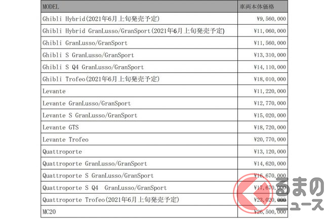 ギブリ ハイブリッドの日本での発売は、2021年6月上旬を予定しており、車両価格(消費税込)は956万円からとなる。