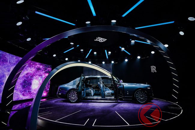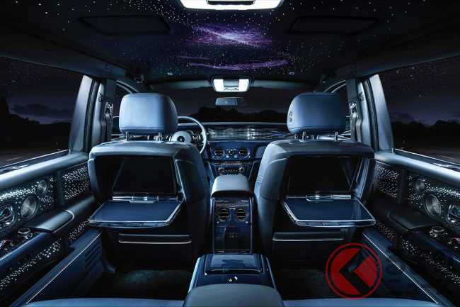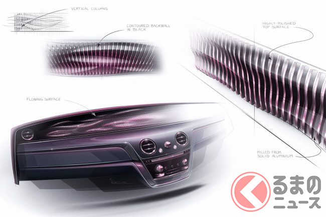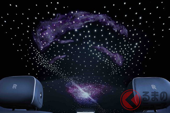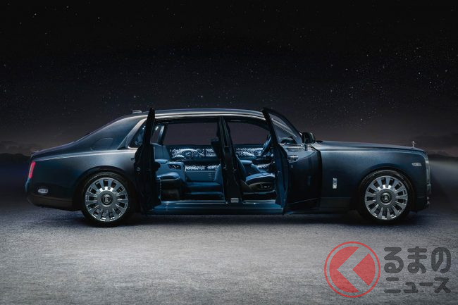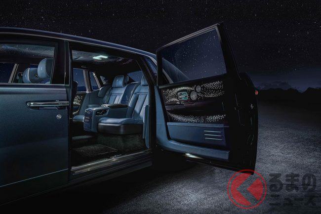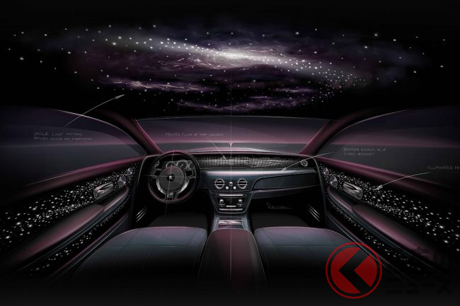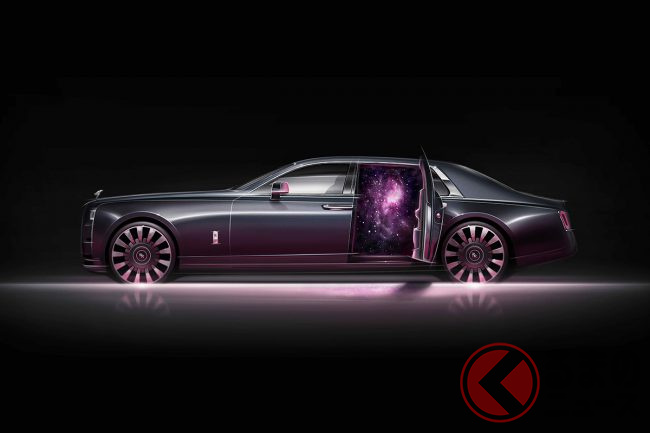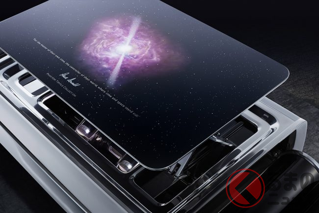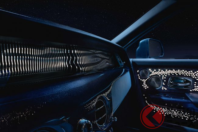 また、ファントムのダッシュボードに組み入れられた小さなアートスペース「ギャラリー」は、パルサー(短周期で電波を放射する電波天体)にインスパイアされたというアルミニウムの彫刻「Frozen Flow of Time」で設えられるほか、天井に光ファイバーをきらめかせる「スターライトルーフ」は、4枚のドア側にまで展開。星々の真っただ中にいるかような、不思議な感覚を味あわせてくれるとのことである。