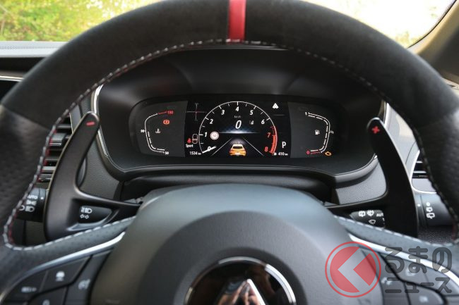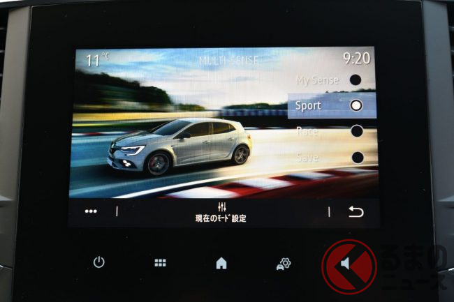 ドライブモードを選択できるルノー・マルチセンスには、「スポーツ」、「レース」、「セーブ」の各モードのほかに、さまざま要素を任意に設定できる「マイセンス」があり、細かくカスタマイズが可能。またアクティブバルブにより、排気音もアクセルオフ時にレーシングカーのような音を出すような演出も楽しめるようになった。