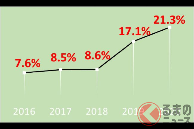 JAFが2020年10月16日に発表した「信号機のない横断歩道」の資料によると、信号機のない横断歩道を歩行者が渡ろうとしている場面で一時停止したクルマの割合は、2016年は7.6%、2017年は8.5%、2018年は8.6%、2019年は17.1%、2020年は21.3%と、年々増加傾向にあるようです。