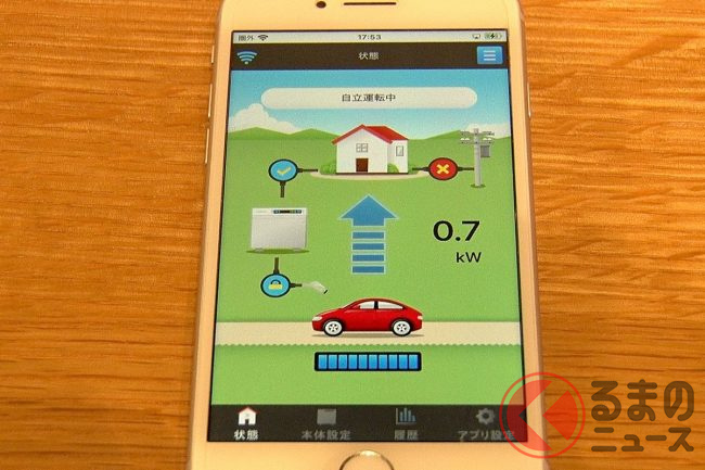 V2Hは、ホンダeから給電されても、電力会社からの通常の給電でも見た目は変わりません。今どこからどの程度の電気を消費しているかは、アプリで確認できます。