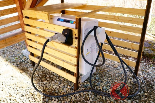 次にV2H機器の電源を入れるため、ホンダeのシガーソケットとケーブルで繋いで起動させます。