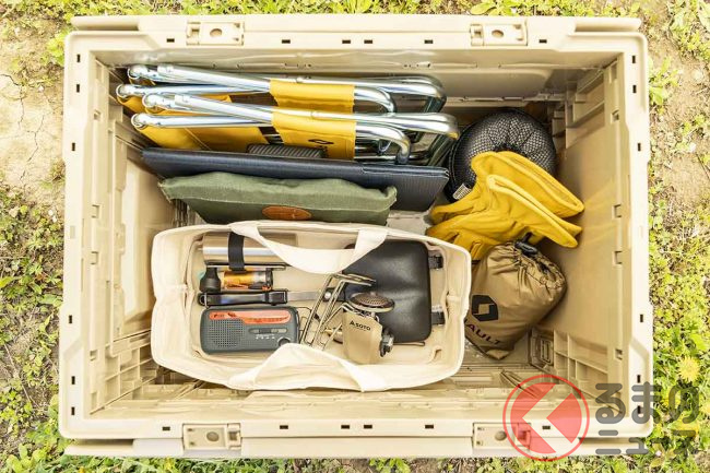 ・プライウッド/ORI-CON SHELF 50L:パッケージに含まれる全アイテムを収納できる50Lの折りたたみコンテナ(オリジナルロゴ入り)