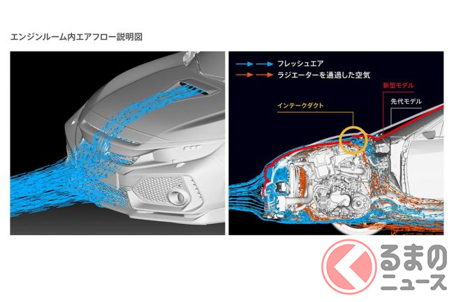 なお、シビック タイプでは同時にフロントバンパー下部からも空気を流し、より効果的に熱気の排出をおこなっています。