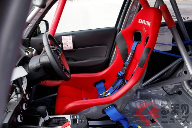 一般的に量産車ベースのレーシングカーはシートポジションが低くロールケージが車内に張り巡らされているうえに、ドライバーはフルフェイスのヘルメットを被るので死角が増える傾向です。