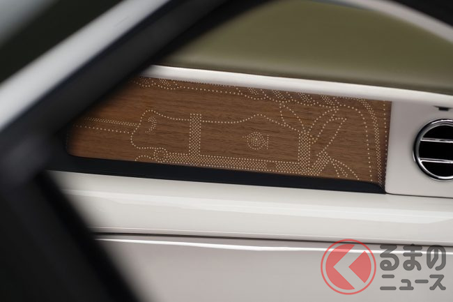 インテリアにおいても、随所にロールス・ロイス・ビスポークのデザインや職人の技術が活かされている。たとえば木製スピーカー・グリルは、ドアに貼られたオープン・ポア・ロイヤル・ウォールナットのベニアに丁寧に穴あけ加工を施したもので、継ぎ目のない美しい質感と繊細な手触りを生み出している。さらに、センター・コンソール、リア・コンソール、ピクニック・テーブルの背面にもオープン・ポア・ロイヤル・ウォールナットが使用されている。