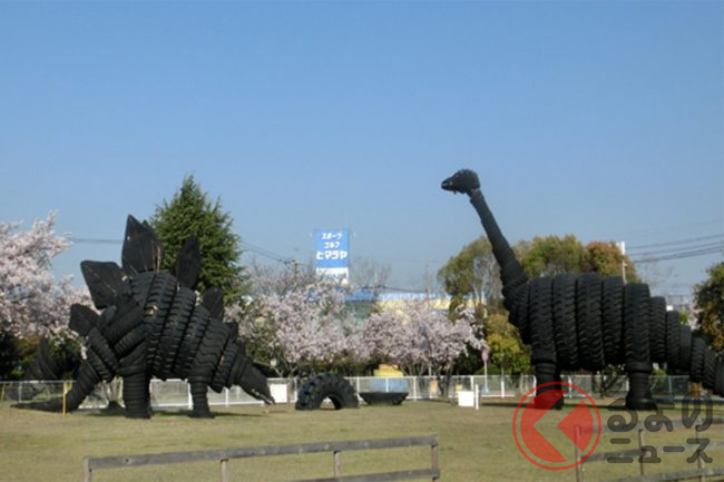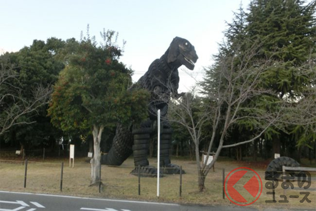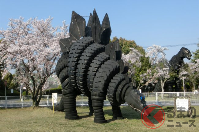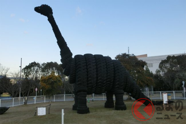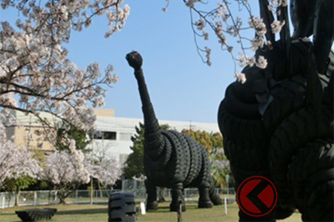 老舗タイヤメーカーである横浜ゴムの尾道工場にある、廃タイヤで作られた巨大な恐竜のオブジェのクオリティがスゴイと、ツイッターなどのSNSで話題となっています。いったい、どんなオブジェなのでしょうか。