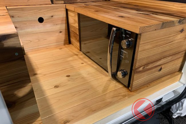 クォッカはハイゼット・パネルバンベースで、後部の箱に断熱アクリル窓を付けて、内部には地元産の富士ひのきをふんだんに奢っています。