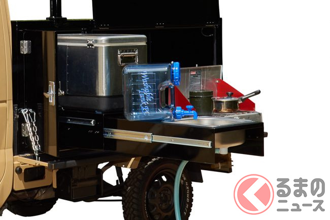 旧モデルのスズキ「キャリイトラック」(マツダ・スクラムトラックでも可)をカスタムした「ベビトラK-150コンプリートカー」と、さまざまなアイテムが収納できる「Dプロイボックス」、そして市場で人気のジェームスバロウドの「SPACE Compact」と「収納式小型テント」が装着されています。