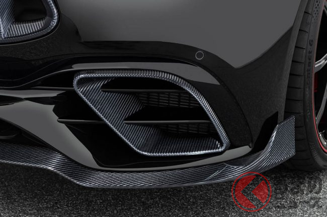 さらにグリルの左右両端にカーボン素材による専用パーツを組み合わせるなど、ルームミラーの中にこのフェイスが映ったのならば、即座に道を譲る覚悟をしなければならない演出は十分といえるだろう。