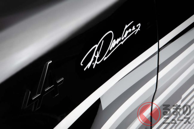 A110のボディに沿ったグラフィックラインは、クルマが止まっていてもスピード感を感じさせるもので、フェリペ・パントン氏のシグネチャーカラーである黒と白を採用している。配色や幾何学的な模様、そして光学的な効果により、A110に新たな光を当て躍動感を高めている。