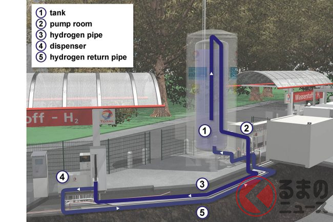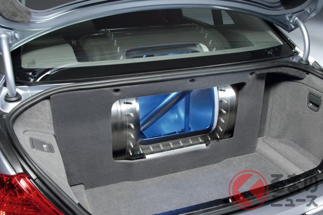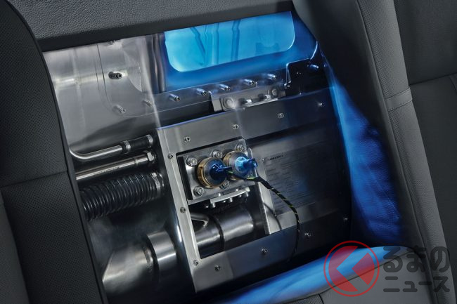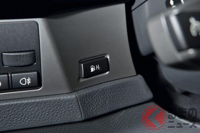 通常のガソリンタンクの容量を減らすことで得たスペースに、最大容量8kgの液化水素タンクを設置。水素燃料による走行可能距離は最大200kmと謳われていたが、やはりこの「足の短さ」が大きな足かせとなり、本来の実用化はまだ先と判断されてしまった。