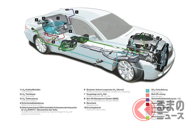 しかし、水素燃料を用いた内燃機関の研究は前世紀からおこなわれており、「エンジン屋」として世界に名を轟かせているBMWは、あくまで実験的なものながらシリーズ生産にもチャレンジしていた。