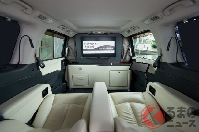 DNP・日産自動車・ゼンリン・ソフトバンク・クワハラの5社が、「移動会議室」の実証実験を2021年6月28日から開始すると発表。今回始まるのは、「移動会議室」仕様の日産「エルグランド」を用いて、ハイヤー事業を展開するという実験です。