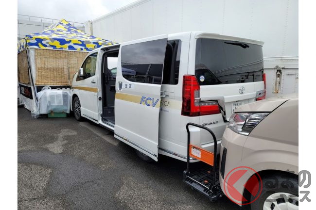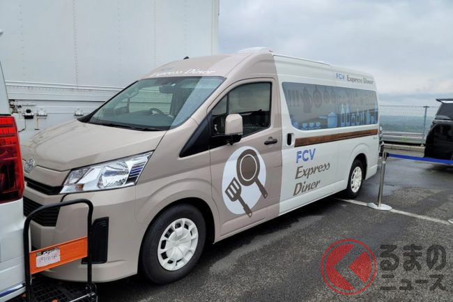 燃料電池電気自動車(FCV)の「MIRAI」とFCVにコンバートされた「グランエース」がパドック周りの電源を供給、さらにはチーム関係者のお腹を満たすためのキッチンカーには、日本未発売の「ハイエース(300系)」が用意され、これもFCVにコンバートされたモノです。