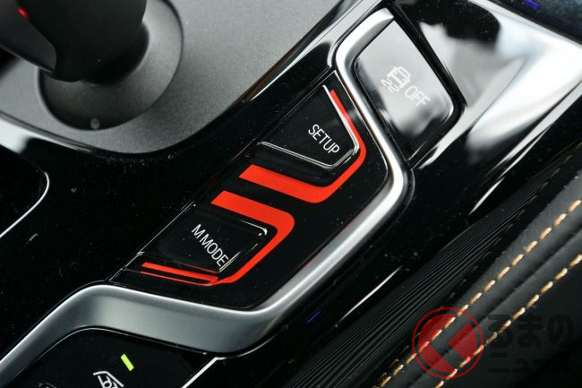 薄い青、濃い青、赤の3色ストライプがMモデルを示すものなのは有名だ。リモコンキーにも、ドアを開けて乗り込むときにはスカッフプレートにも、シートベルトにも、ボンネットを開けるとエンジンカバーにも描かれている斜めの3色ストライプが目に入ってくる。