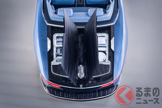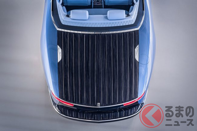 このクルマの美しいテールを形成するリアデッキは、往年のロールス・ロイスにも複数の作例が見られた「ボート・テイル」スタイルの木製リアデッキを、現代的に解釈したウッドパネルが配される。