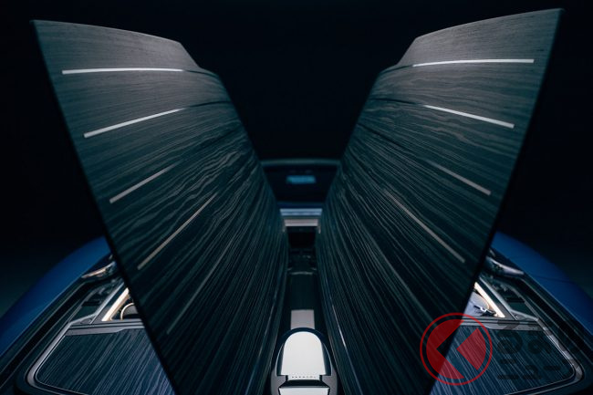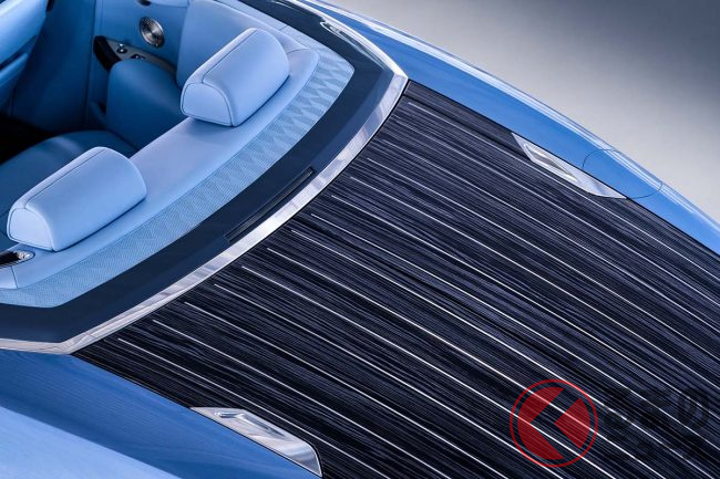 このべニアパネルは木目を残したオープンポア塗装に、つや消しステンレス鋼製のピンストライプ・インレイをあしらい、今も昔も変わらない高級ボート/ヨットの典型的な木製構造へのオマージュを体現。さらにロールス・ロイスの木材スペシャリストの研ぎ澄まされたスキルによって、ボディ形状に合わせて木目を操作することで、左右対称の「ブックマッチ」としている。