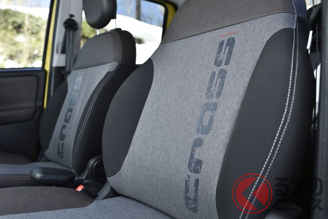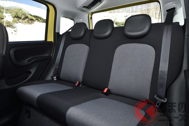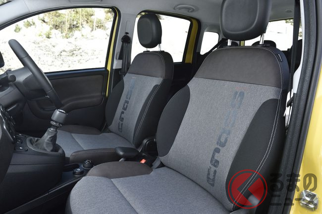 パンダ・クロス4×4がベースの「パンダ4×4」と決定的に違うのは、“クロス”の名前が示すとおりの、ちょっとばかりワイルドなオフローダー風味のルックスが与えられているところだろう。ヘッドランプ周りを黒で縁取り、その目元にフォグランプを埋め込み、フロントバンパーの下側にはシルバーのスキッドガードを備え、そこに左右一対の赤いトウフックを埋め込んでいる。リアバンパーもスキッドガード風のデザインとなり、コンビネーションランプもフロント同様、黒のプロテクションで覆っている。これを普通のクルマでやると後付け感たっぷりのわざとらしい感じになっちゃいそうなものだけど、そうは思わせず、ヤンチャなイタズラ坊主みたいな微笑ましさを見る人に感じさせる辺り、パンダ特有のキャラクターなのか、イタリアンデザインの妙なのか。