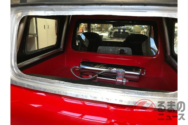 エアサスで車高を下げていますが、それだけでは地面着地は出来ない為、相当なボディ加工もおこなっているうえ、ピックアップ化もしています。
