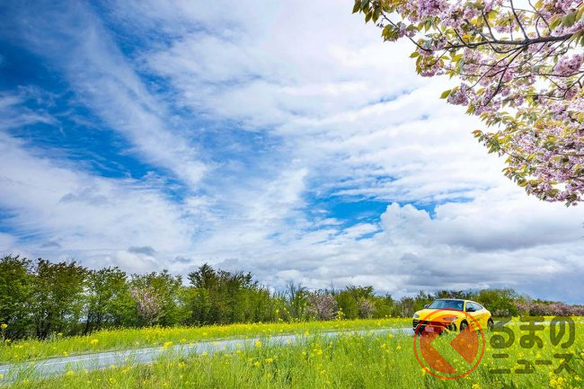 初日、秋田駅を出発。てっきり男鹿半島でも目指すのかと思ったら、八郎潟だった。桜が目当てか? 生憎、今年の咲きは早い。かろうじて八重桜が残っており、満開の菜の花と緑を交えた桃と黄の美しいコントラストを見せている。イエローとブルーのウルスがよく映える。