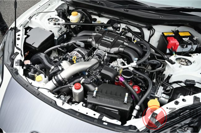 総合チューニングパーツメーカーであるHKSの「GR86」用パーツでは、スタイリングパーツをはじめサスペンションや排気系などひととおり手が入っているのに加え、注目は過給機の装着。