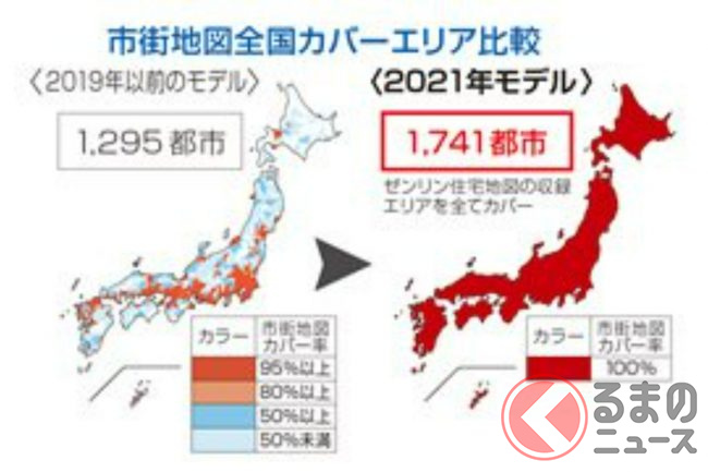 これにより全国の市街地を100%カバーし、全国どこでも建物の形状や河川の形状、および道幅までわかる詳細な地図表示が可能です。