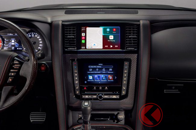 両車の内装を見ると、新型ランドクルーザーはインパネ中央にひとつのディスプレイを配置していますが、パトロールはインパネ中央に上下2画面のデュアルディスプレイを採用しています。