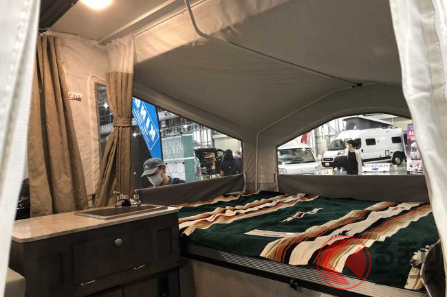 内部に入ってみると「外から見るよりかなり広い」という印象です。前後に広がった部分がそれぞれダブルベットサイズの就寝用の空間となり、トレーラー中央部はダイニングキャビンとシンクを完備。前後テント部分は外の風が入るのでとても開放的です。