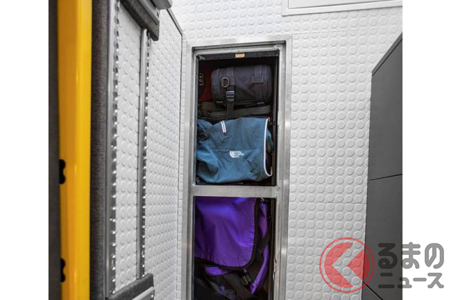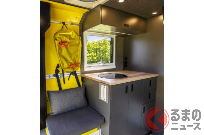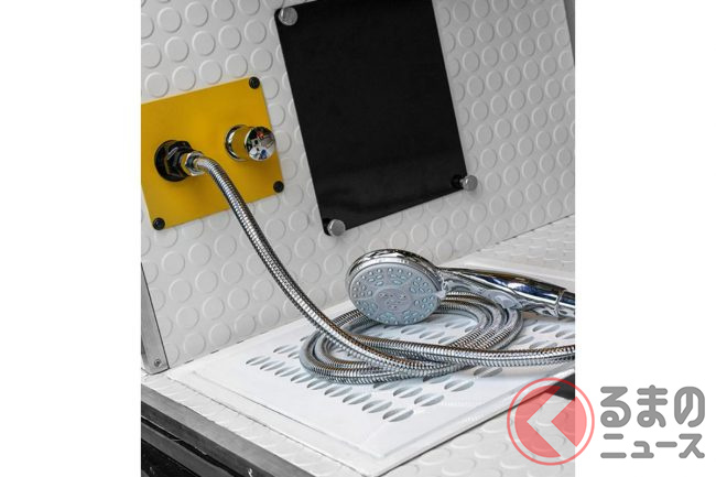 室内はシャワーなどの装備が整ったマッドルーム、冷蔵庫やシンクなどが付いたキッチンエリア、シートやデスクのついたラウンジエリア、クイーンベッドサイズのベッドが置けるベッドルームエリアの4つのエリアに分かれています。