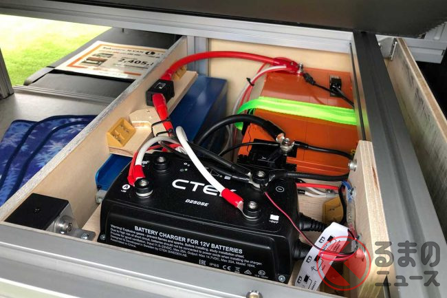 Rakuneru N-VANの標準装備は、シートを倒した状態でアルミフレームで架装してフルフラットになるベットマットを敷くベットキット、フロアの加工、サイドテーブル、走行充電バッテリー、車内LED照明、スイッチパネル+集中スイッチ、1500W 正弦波インバーター、外部充電システムがセットとなっており、金額は新車N-VANにプラス100万円となります。
