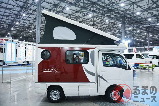 写真は東和モータースの軽キャンパー「インディ108」。ベースがダイハツの「ハイゼットトラック」で、最新の衝突被害軽減自動ブレーキを装備しているのが特徴です。