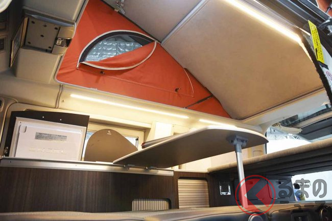 軽自動車をベースにするため、キャンピングカーとしては室内空間のサイズは最小限。水回りに関しては、キッチンはありますが、シャワーやトイレまで設置されるケースはほとんどありません。室内空間を拡大するために、2階にも就寝スペースを作るポップアップルーフを装備する車種もあります。