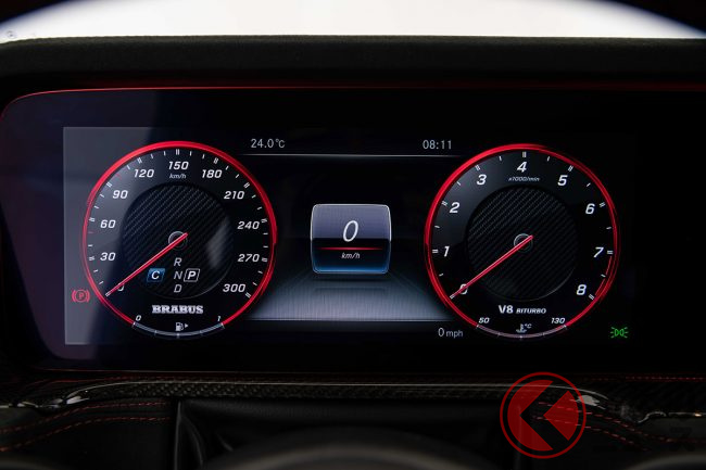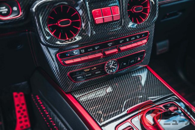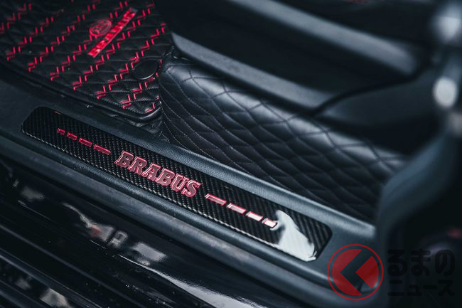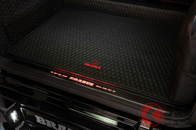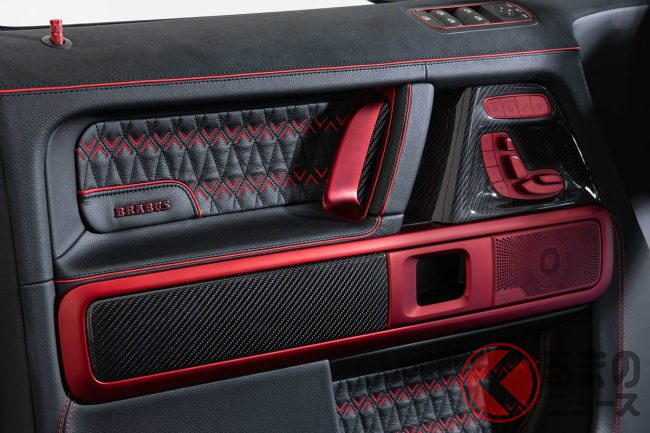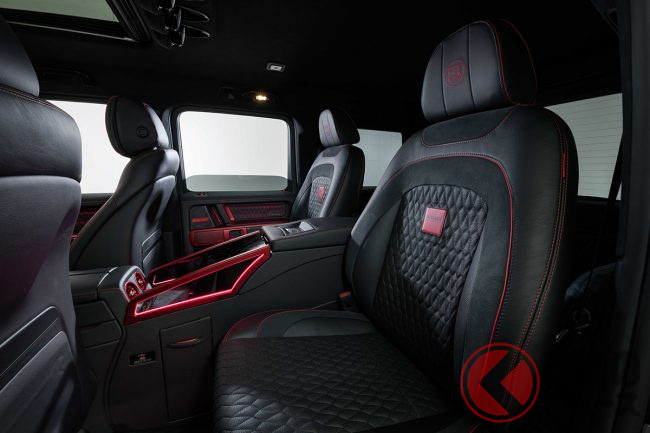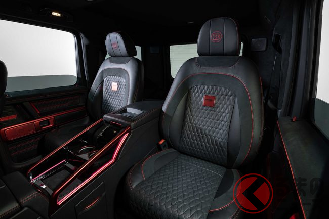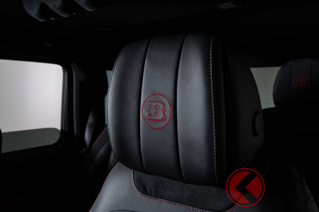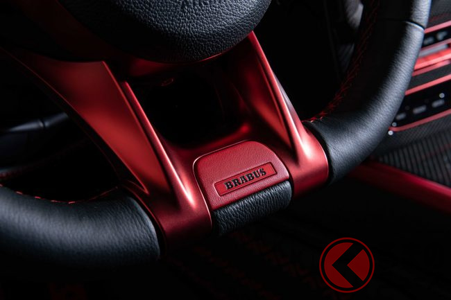 ブラバスの文字が輝くサイドシルを超えると、そこにあるのは豪華なレザーインテリアだ。インテリアの基本は4シーターだが、カスタマーの希望によっては5シーターでの製作も可能のようだ。ステアリングホイールなど、レッドをあしらったデザインも、それが特別なG63であることを物語っている。