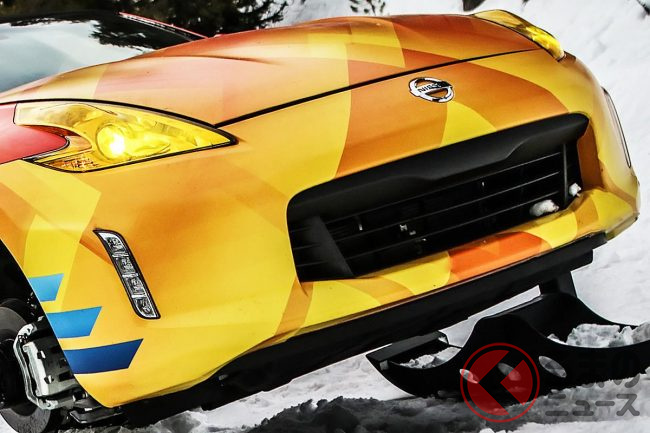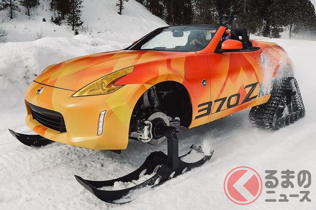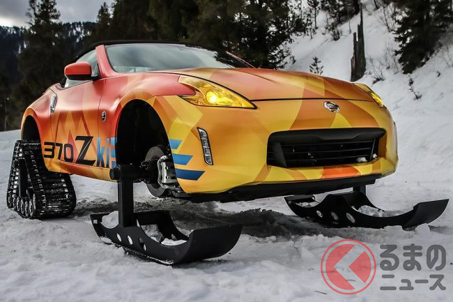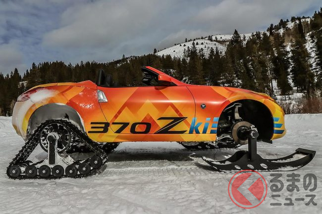 ベースとなったのは北米仕様のオープンモデル「370Zロードスター」で、タイヤの代わりにフロントにスキーが装着され、リアはトラックベルトとなっており、車名は「370Zki」と命名。370Zkiの「Z」を「S」に見立てて「370スキー」と呼びます。