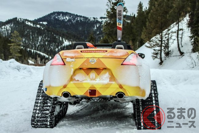 SUVやクロスカントリー車にトラックベルトを装着する例は珍しくなく、日本でもスキー場や豪雪地帯で活躍していますが、生粋のスポーツカーであるフェアレディZをベースにスノーモービルに仕立てたのは、いかにもアメリカらしいところです。