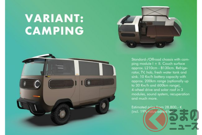 価格は1万5800 ユーロ(約208万円)からで、オフロードシャシにキャンプモジュールを積んだキャンピングカー仕様で2万8800ユーロ(約380万円)です。