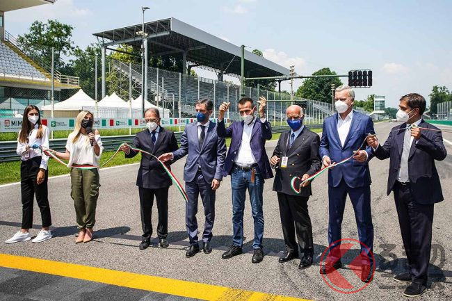 その後、参加者全員でサーキットのメインストレートまで歩いて行き、MIMOのモンツァ編のオープニングセレモニー、テープカットがおこなわれた。無観客のなかでおこなわれた静かなセレモニーの方が、むしろサーキットとの距離が縮まったような気がする。サーキットならではのオープニングに相応しいロケーションだった。