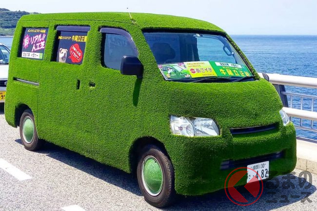 一見、車検適応かどうか心配に感じる人もいるかもしれませんが、芝を張っていることは車検を通すうえで問題なく、問題となりえるライト類やナンバーの視認性はしっかりと確保されるように工夫がされています。