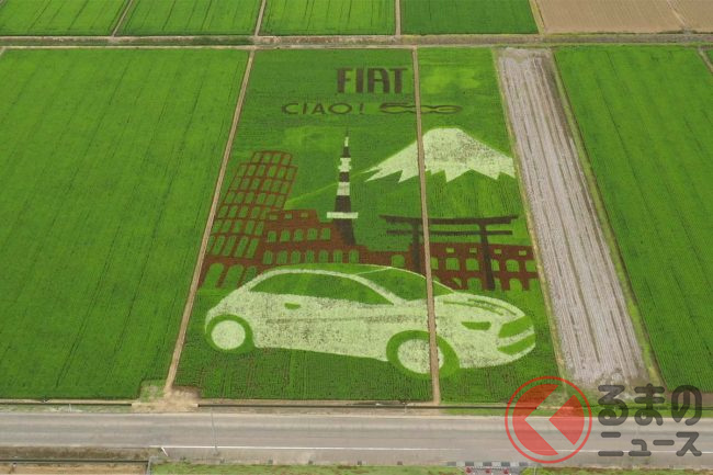 色の異なる稲を使って絵を描く田んぼアートは、これまでフィアットがおこなってきた日本のものづくり支援「Made In Japan Project」の一環である。