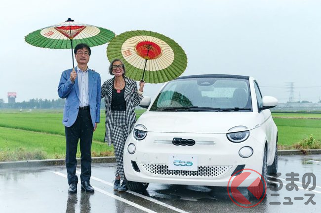 美しい田んぼアートの他に招待者の目を釘付けにしたのが、新型モデルのサプライズプレビューである。イベント会場には、フィアット初の電気自動車「500e(チンクエチェントイー)」のテスト車両もサプライズ展示された。