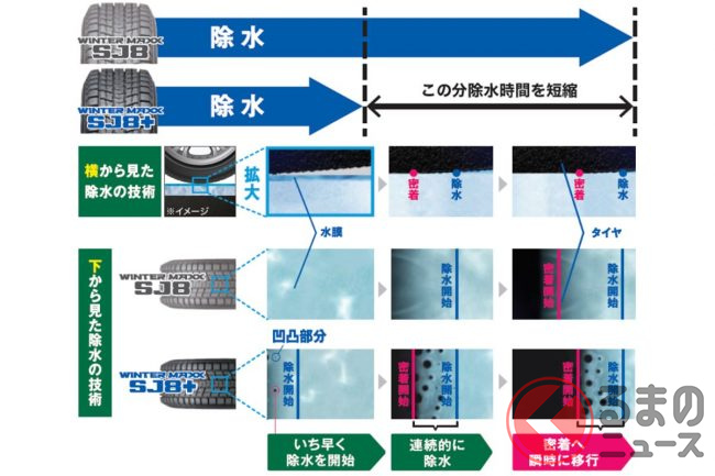 ナノ凹凸ゴムの柔らかな凹凸構造の突起部分が起点となり、タイヤと路面との間の滑りの原因である水膜を素早く押し出すことで、除水から密着へ瞬時に移行、従来品のウインターマックスSJ8に比べて1.5倍から2倍も除水スピードを早めています。