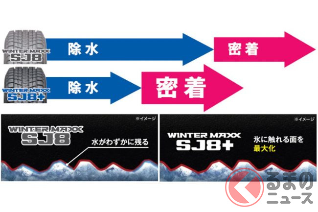 新ウインターマックスSJ8+は、ダンロップ史上最高の氷上性能を実現したスタッドレスタイヤ「WINTER MAXX 03(ウインターマックス03)」に採用した「ナノ凹凸ゴム」を、SUV用スタッドレスであるウインターマックスSJ8のパターンと組み合わせることで、氷上性能を大幅に向上させています。つまり、パターンは従来のまま、ゴムのみ変更しています。