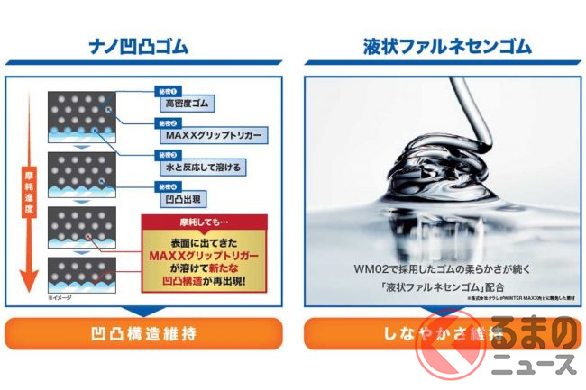 また高密度のナノ凹凸ゴムに含まれる「MAXXグリップトリガー」は、水と反応して溶ける性質を持っており、摩耗しても繰り返し凹凸構造が出現するため、溝が減っても安心して使用することが可能で、ロングライフを実現しています。さらにゴムと軟化剤の二面性を持つ「液状ファルネセンゴム」を採用することで、低温下での密着とゴムの柔らかさを実現。しなやかさが続くため時間が経っても氷上性能が低下しにくくなります。つまりロングライフ性能と効き持ち性能を両立しているのが特徴となります。